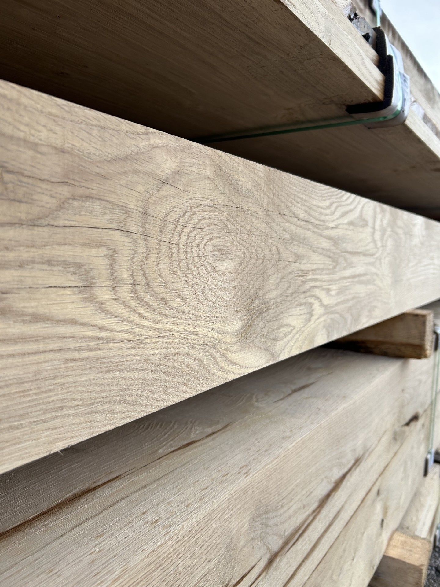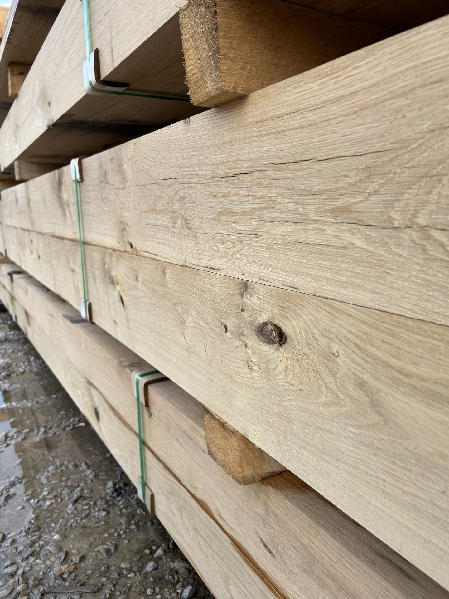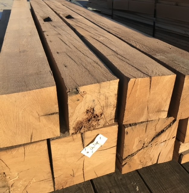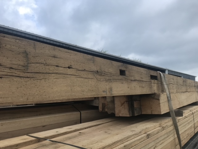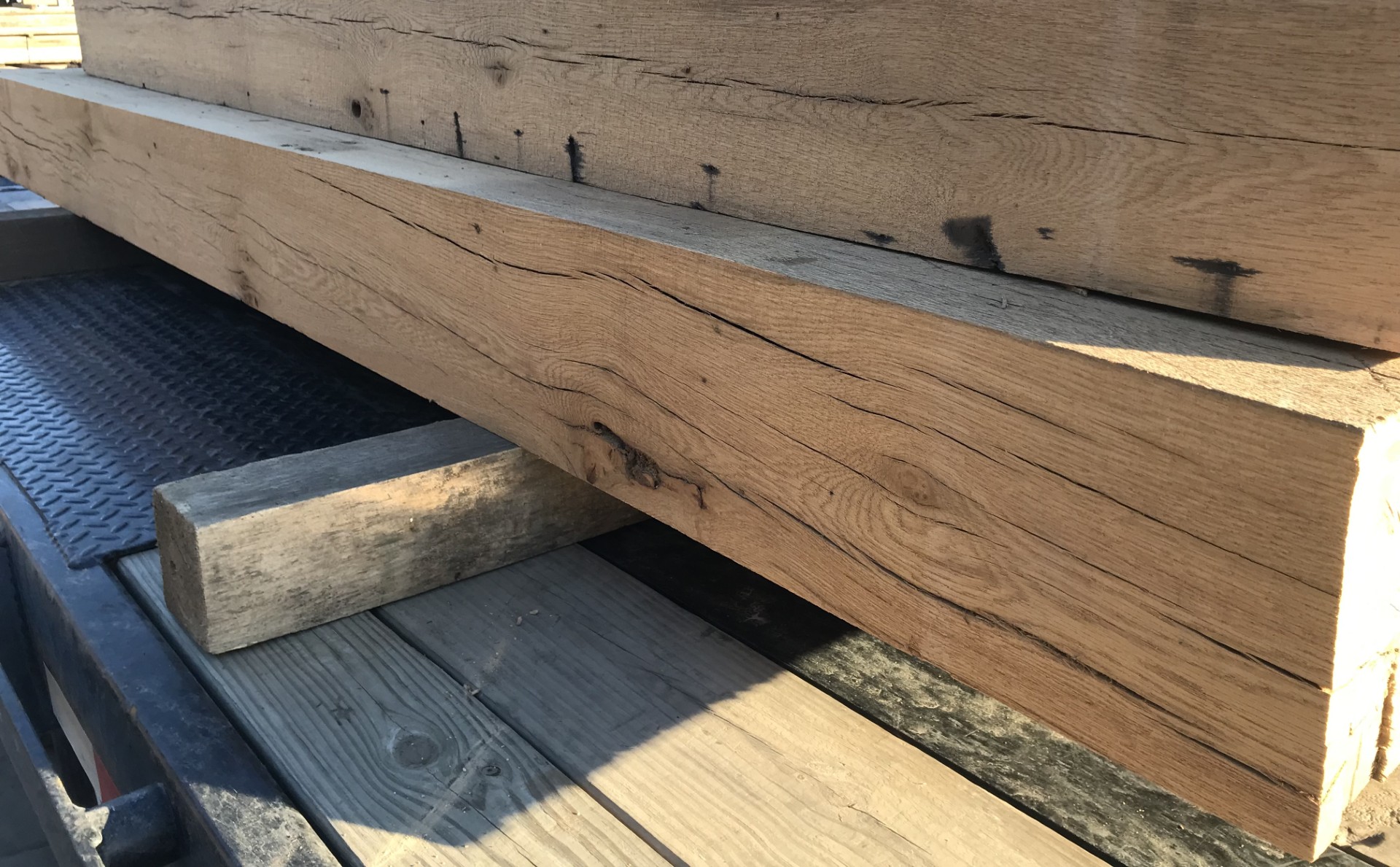 On a recent trip out to the mid-west I had the pleasure of visiting one of the largest reclaimed wood distributors in the US. These trips can be time consuming, but the benefit is that I get to see the material and ask questions in person. I was shown rustic white oak timbers that the mill was air drying for future customers. The timbers were dead straight and square which is near impossible to find when hunting for reclaimed beams. They contained splits, checks and knots just like you’d see in reclaimed material, but they had no mortise and tenon or oxidized nail streaks. Reclaimed timbers tell a story by the markings and character that they contain, the rustic timbers were devoid of these features. Reclaimed timbers have been air drying for decades, and often over a century, so they can be a bit more predictable when installing in the field. Rustic timbers are technically green lumber meaning that the moisture content at the center of the wood is still relatively high. If your plan is to leave these rustic timbers “as is” then air drying is acceptable although the beams may go through some minor splitting and moving as they adjust to their new home and as the seasons change. If you are cutting 1″+ skins from these timbers, those skins would need to be kiln dried prior to installation.